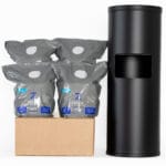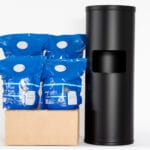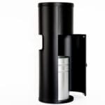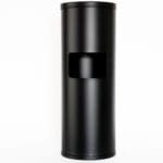 - Floor-standing matte black dispenser with integrated trash can